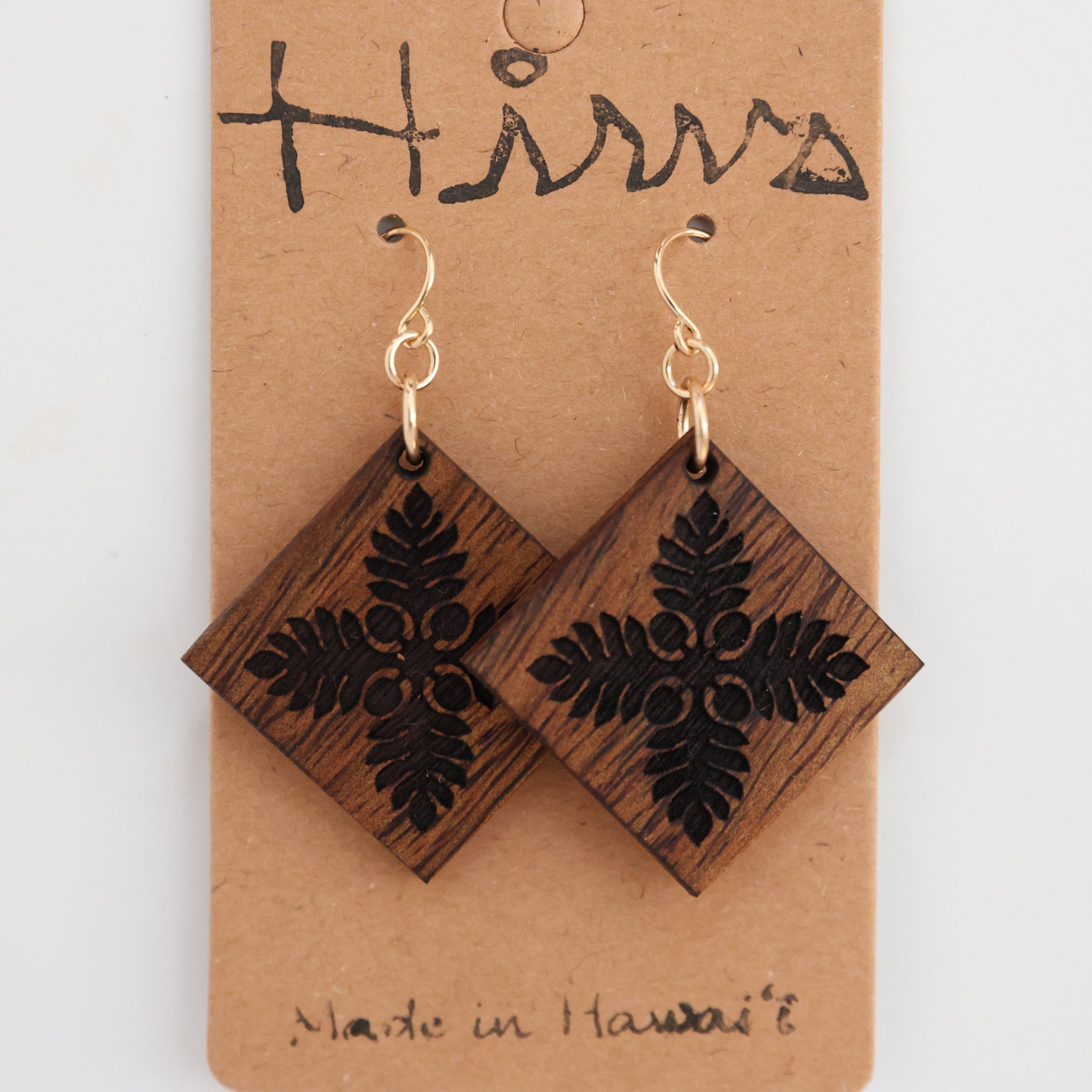 'Ulu Quilt design earrings made with Hawaiian Koa Wood.