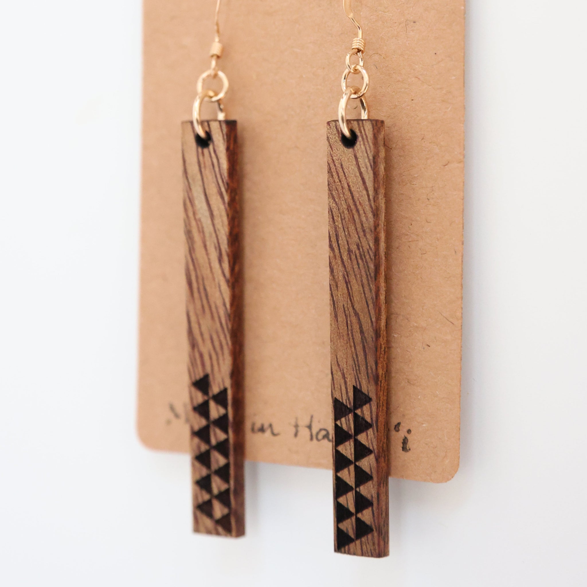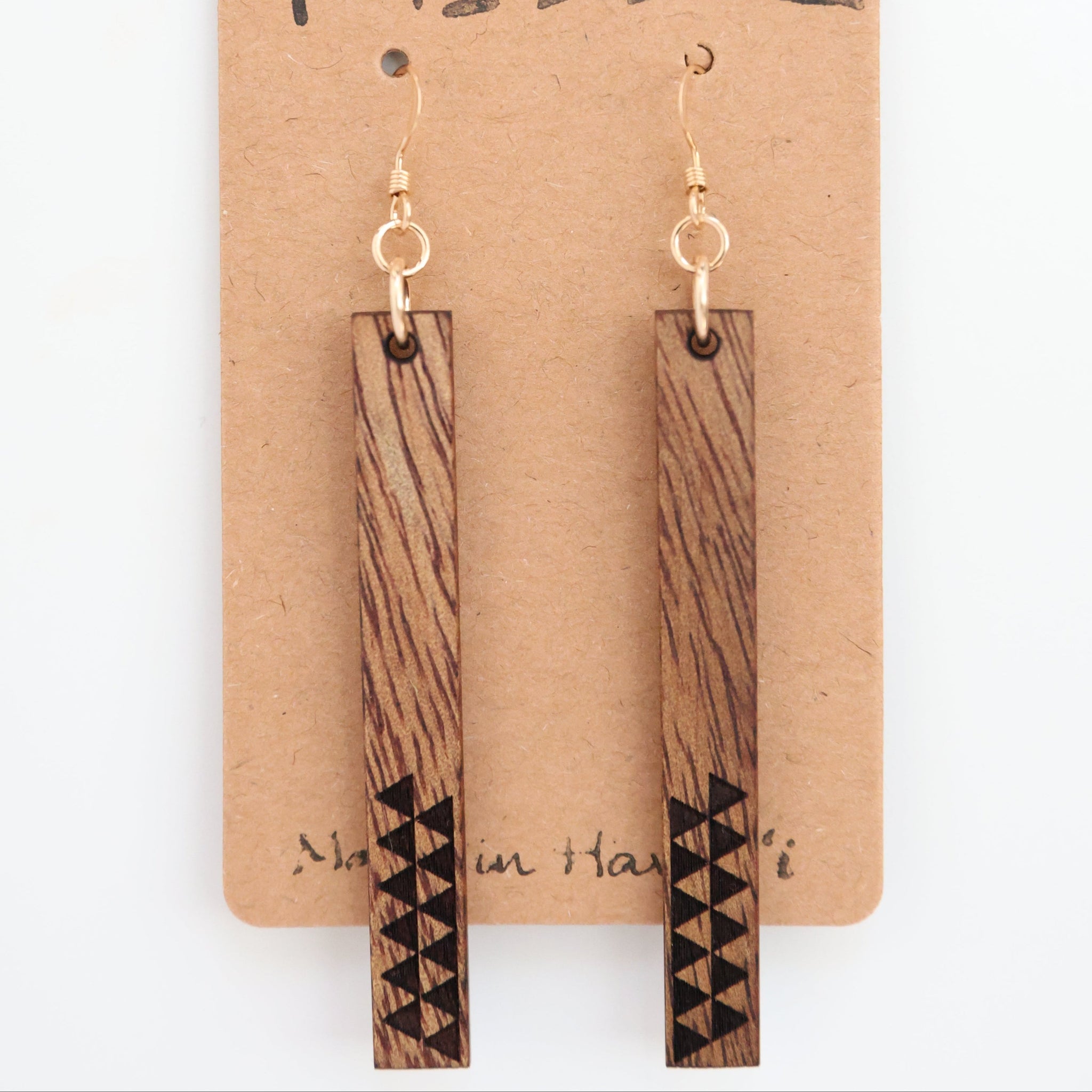 Huinakolu, Triangle, Kapa pattern design earring made with Hawaiian Koa Wood.